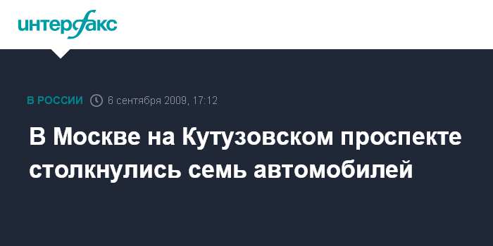 Москва. 6 сентября. INTERFAX.RU - Крупная дорожная авария произошла в Москве в воскресенье, сообщили "Интерфаксу" источники в правоохранительных органах. "По предварительным данным, около 16:50 напротив дома 28 по Кутузовскому проспекту произошло столкновение семи автомобилей. В результате ДТП ранения различной степени тяжести получили четыре человека, в том числе один ребенок", - рассказал собеседник агентства.