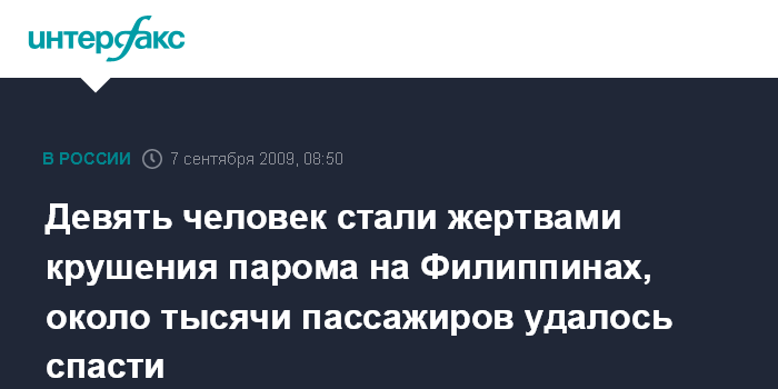 Москва. 7 сентября. INTERFAX.RU - До девяти человек увеличилось количество погибших в результате крушения парома на Филиппинах, около тысячи человек, находившихся на судне удалось спасти, передает американский телеканал Си-Эн-Эн.