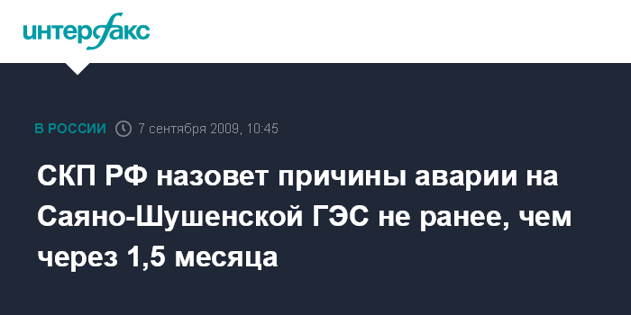 Москва. 7 сентября. INTERFAX.RU - Основные выводы о причинах аварии на Саяно-Шушенской ГЭС будут сделаны не раньше чем через полтора-два месяца, заявил председатель Следственного комитета при прокуратуре (СКП) РФ Александр Бастрыкин.