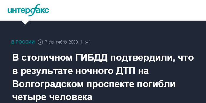 Москва. 7 сентября. INTERFAX.RU – В отделе пропаганды Управления ГИБДД Москвы "Интерфаксу" подтвердили, что в результате дорожно-транспортного происшествия на Волгоградском проспекте, произошедшего в ночь на понедельник, погибли, по уточненным данным, четыре человека.