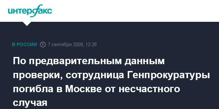 Москва. 7 сентября. INTERFAX.RU – Сотрудница Генеральной прокуратуры России погибла в результате несчастного случая, а не покончила с собой, заявили в столичном управлении СКП РФ.