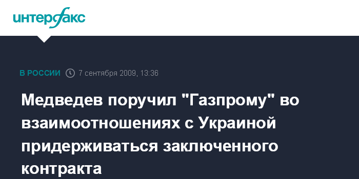 Москва. 7 сентября. INTERFAX.RU - Президент РФ Дмитрий Медведев поручил главе "Газпрома" Алексею Миллеру во взаимоотношениях с Украиной придерживаться заключенного контракта, не соглашаться на изменения условий по оплате транзита российского газа через Украину. О том, что такие предложения звучат из Киева, Миллер проинформировал Медведева о время рабочей встречи. Глава государства уточнил, предусмотрен ли предлагаемый порядок расчетов договором, и получил отрицательный ответ главы "Газпрома". "Тогда и не платите!" - посоветовал президент. "Нужно действовать в соответствие с договором, который заключен. Мы специально его готовили, он в муках и трудах достался, мы по нему и работаем", - подчеркнул Медведев.