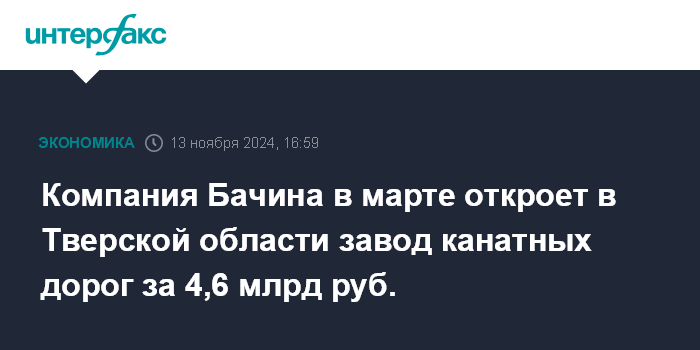 Компания Бачина в марте откроет в Тверской области завод канатных дорог за 4,6 млрд руб.