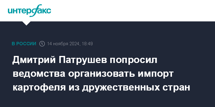 Москва. 14 ноября. INTERFAX.RU - Вице-премьер Дмитрий Патрушев попросил Минэкономразвития и Минсельхоз решить вопрос об импорте картофеля из дружественных стран для того, чтобы удовлетворить спрос на него на внутреннем рынке из-за снижения урожая в этом году, сообщает его пресс-служба.
