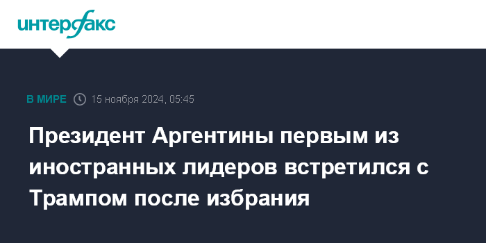 Москва. 15 ноября. INTERFAX.RU - Президент Аргентины Хавьер Милей стал первым иностранным лидером, с которым встретился избранный президент США Дональд Трамп, сообщает Associated Press со ссылкой на осведомленный источник.