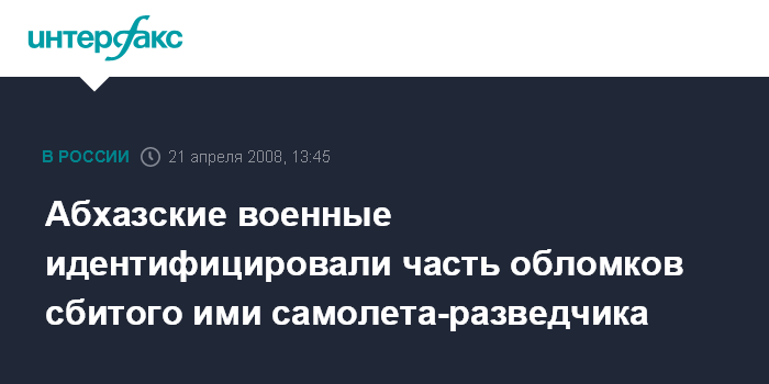 Сухуми. 21 апреля. INTERFAX.RU - Часть фрагментов беспилотного летательного аппарата, сбитого 20 апреля в небе над Абхазией, найдена. "Они (обломки - ИФ) идентифицированы, поиск остальных частей сбитого самолета-разведчика продолжаются", - сообщил "Интерфаксу" заместитель министра обороны республики, начальник Генерального штаба вооруженных сил непризнанной республики Анатолий Зайцев.
