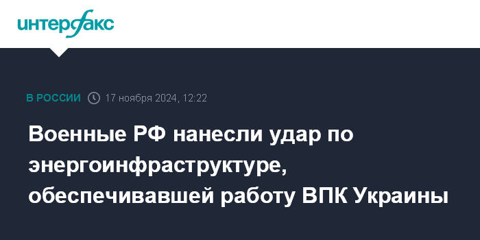 Военные РФ нанесли удар по энергоинфраструктуре, обеспечивавшей работу ВПК Украины