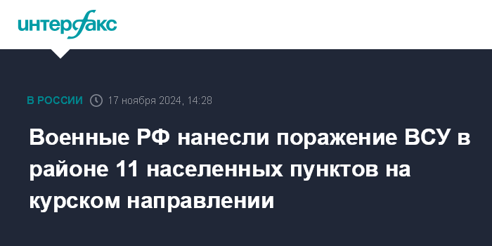 Москва. 17 ноября. INTERFAX.RU - Войска группировки "Север" на курском направлении за сутки нанесли поражение украинским формированиям в районе одиннадцати населенных пунктов, сообщает Минобороны РФ в воскресенье.