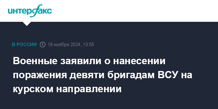 Москва. 18 ноября. INTERFAX.RU - Войска группировки "Север" на курском направлении за сутки нанесли поражение формированиям девяти украинских бригад, сообщает министерство обороны РФ в понедельник.