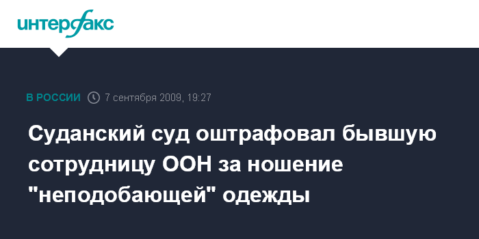 Москва. 7 сентября. INTERFAX.RU - Суд Хартума, столицы Судана, обязал Любну Хусейн, бывшую сотрудницу ООН, заплатить штраф в размере около $200 за ношение "непристойной" одежды в общественном месте, сообщила в понедельник британская телерадиокорпорация BBC. Суд постановил, что в соответствии со статьей 152 законодательства Судана, в момент ареста Л.Хусейн была одета в "непристойную одежду". Во время оглашения вердикта Л.Хусейн была одета в те же широкие брюки и платок, как и во время ареста. Согласно вердикту суда, 30-летняя Хусейн будет приговорена к месячному сроку тюремного заключения в том случае, если откажется заплатить штраф.