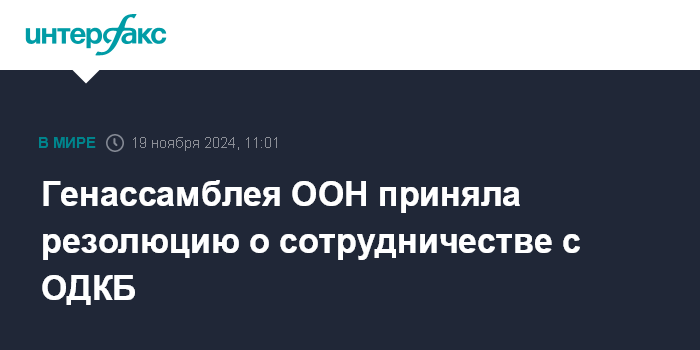 Москва. 19 ноября. INTERFAX.RU - Генеральная Ассамблея ООН в ходе 79-й сессии приняла резолюцию о сотрудничестве между Организацией Объединенных Наций и Организацией Договора о коллективной безопасности, сообщила во вторник пресс-служба ОДКБ.