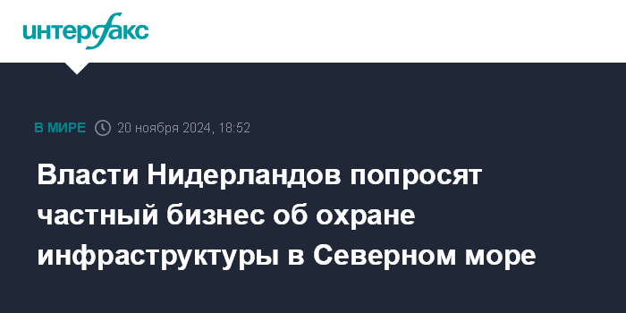 Москва. 20 ноября. INTERFAX.RU - Правительство Нидерландов планирует временно задействовать персонал и оборудование частных компаний для охраны инфраструктурных объектов в водах страны в Северном море, сообщают западные СМИ.