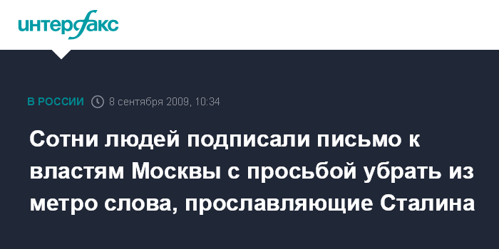 Москва. 8 сентября. INTERFAX.RU – Правозащитники просят московские власти убрать из интерьера станции метро "Курская" строку из гимна СССР, которая прославляет советского лидера Иосифа Сталина.
