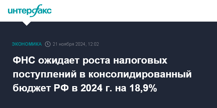 ФНС ожидает роста налоговых поступлений в консолидированный бюджет РФ в 2024 г. на 18,9%
