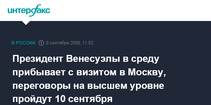 Москва. 8 сентября. INTERFAX.RU – Президент Боливарианской Республики Венесуэла Уго Чавес 9-10 сентября посетит Россию с рабочим визитом, сообщает во вторник пресс-служба Кремля.