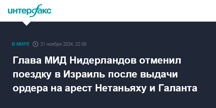 Москва. 21 ноября. INTERFAX.RU - Министр иностранных дел Нидерландов Каспар Велдкамп отменил запланированную на следующую неделю поездку в Израиль после того, как страна объявила о намерении выполнить предписания Международного уголовного суда (МУС), выдавшего ордеры на арест израильского премьера Биньямина Нетаньяху и экс-главы министерства обороны Йоава Галанта, сообщает The Times of Israel со ссылкой на офис главы МИД Израиля Гидеона Саара.