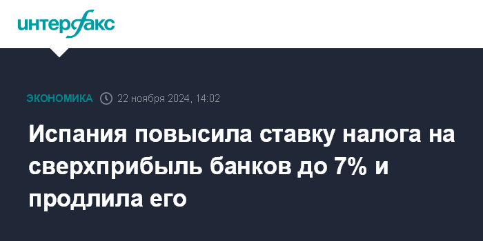 Москва. 22 ноября. INTERFAX.RU - Правительство Испании продлило действие налога на сверхприбыль банков, повысив, при этом, его ставку.