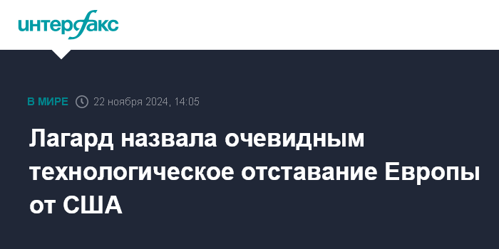 Москва. 22 ноября. INTERFAX.RU - Председатель Европейского Центробанка Кристин Лагард выразила опасение в связи с тем, что Европа проигрывает Соединенным Штатам в технологической гонке.