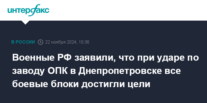 Москва. 22 ноября. INTERFAX.RU - Российские военные заявили, что удар 21 ноября по предприятию ОПК в Днепропетровске с применением новой ракеты средней дальности нанесен в ответ на использование Украиной американского и британского оружия против объектов на территории РФ.