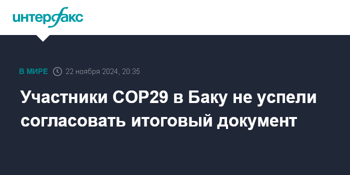 Москва. 22 ноября. INTERFAX.RU - Делегации на климатической конференции ООН COP29 в Баку не сумели в срок завершить работу над итоговым документом и теперь продолжат консультации, сообщает в пятницу французская радиостанция "Франс-энфо".