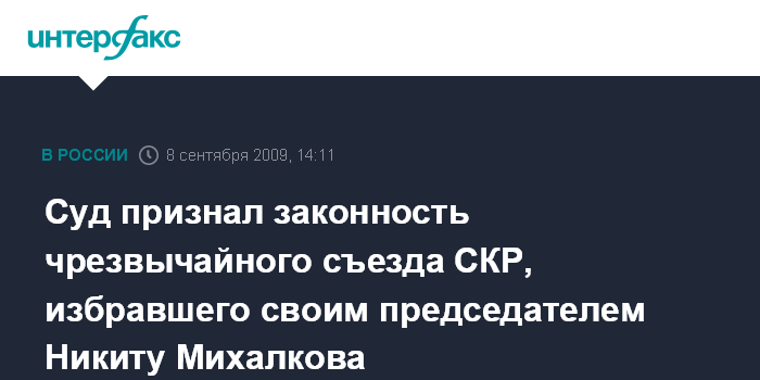 Москва. 8 сентября. INTERFAX.RU - Пресненский суд Москвы признал легитимным чрезвычайный съезд Союза кинематографистов России, на котором председателем СКР был избран кинорежиссер Никита Михалков, передал корреспондент "Интерфакса".