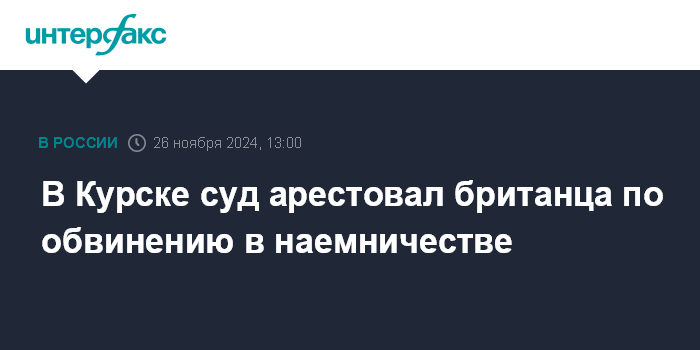 Москва. 26 ноября. INTERFAX.RU - В Курске Ленинский суд арестовал подданного Великобритании Джеймса Скотта Риса Андерсона по обвинению в преступлениях, совершенных в составе украинской армии на территории Курской области, сообщила пресс-служба судов региона.