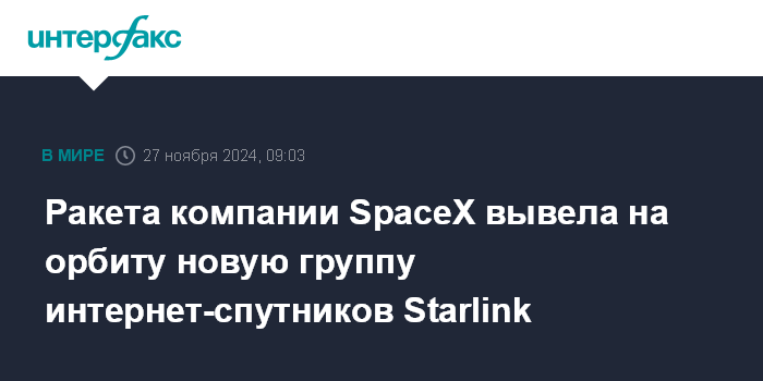 Москва. 27 ноября. INTERFAX.RU - Ракета-носитель Falcon 9 в среду успешно вывела на орбиту очередную партию из 24 мини-спутников для пополнения орбитальной группировки глобальной сети интернет-покрытия системы Starlink, сообщила компания-разработчик SpaceX.