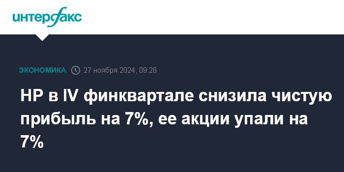 Москва. 27 ноября. INTERFAX.RU - Американская HP Inc. в четвертом квартале 2024 финансового года сократила чистую прибыль на 7% и увеличила выручку на 1,7%, при этом выручка немного превысила прогнозы аналитиков, а скорректированная прибыль с ними совпала.