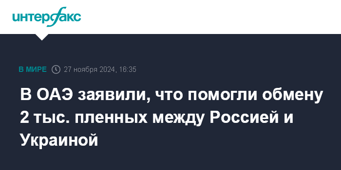 Москва. 27 ноября. INTERFAX.RU - ОАЭ оказали поддержку обмену 2 тыс. пленных между Россией и Украиной, сообщил посол ОАЭ в Туркменистане Ахмед Альхай Аль-Хамели.
