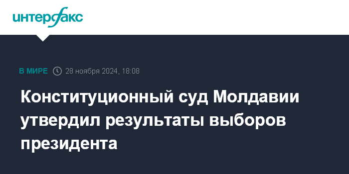 Москва. 28 ноября. INTERFAX.RU - Конституционный суд Молдавии в четверг утвердил результаты выборов президента, второй тур которых состоялся 3 ноября.