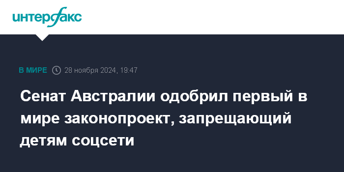 Москва. 28 ноября. INTERFAX.RU - Сенат Австралии в четверг одобрил законопроект, который предполагает запрет на использование соцсетей людьми младше 16 лет, сообщает Associated Press.