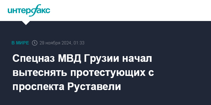Москва. 29 ноября. INTERFAX.RU - В Тбилиси в ночь на пятницу полицейский спецназ начал вытеснять протестующих против приостановки евроинтеграции Грузии с проспекта Руставели.