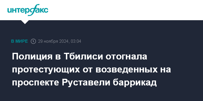 Москва. 29 ноября. INTERFAX.RU - Полиция в Тбилиси с применением водометов и слезоточивого газа продолжает вытеснять участников акции протеста с проспекта Руставели.