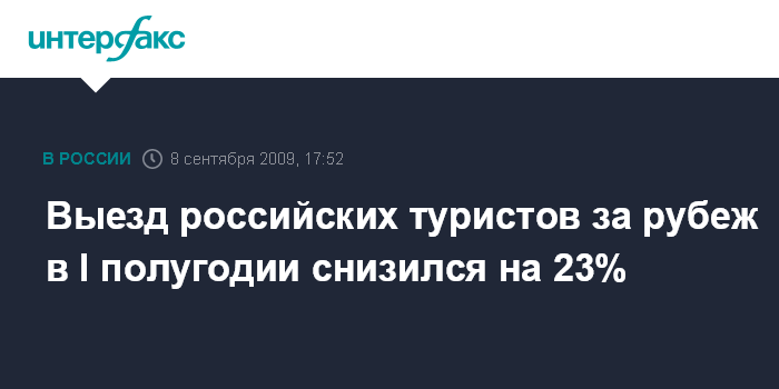 Москва. 8 сентября. INTERFAX.RU - За первое полугодие 2009 года поток российских туристов за рубеж сократился на 23%, сообщил во вторник журналистам руководитель Федерального агентства по туризму (Ростуризм) Анатолий Ярочкин. При этом, по его словам, снижение туристического потока в Испанию составило 17%, Египет - 8%, Турцию и Грецию - по 19%, Китай - 60%. Он также сообщил, что въездной поток в Россию за аналогичный период снизился на 15%. "Поток туристов из Германии снизился на 12%, США - 10%, Италии - 33%, Украины - 60%, Израиля - 18%", - сообщил Ярочкин.