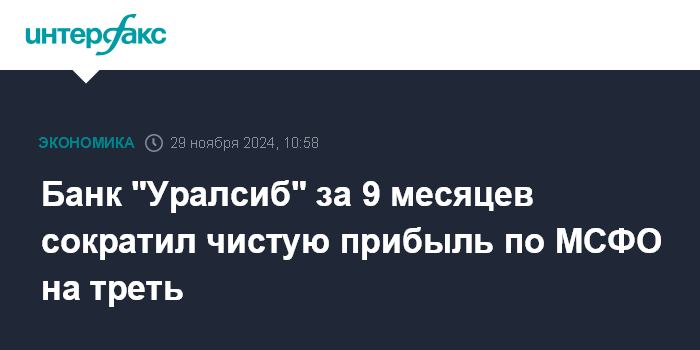 Москва. 29 ноября. INTERFAX.RU - Банк "Уралсиб" за 9 месяцев 2024 года сократил чистую прибыль по МСФО на 32,5% - до 7,65 млрд рублей, сказано в отчете кредитной организации.