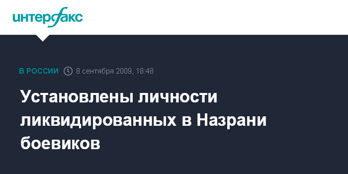 Москва. 8 сентября. INTERFAX.RU - Правоохранительные органы выяснили личности боевиков, которые были уничтожены в ходе антитеррористической операции в Назрани. Как сообщили агентству "Интерфакс-Юг" в МВД Ингушетии, это жители Назрани Ахмет Цороев и Магомет Орцханов, которые ранее проходили по оперативной информации как члены незаконных вооруженных формирований.