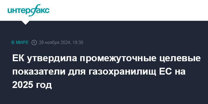 Москва. 29 ноября. INTERFAX.RU - Еврокомиссия (ЕК) объявила в пятницу о том, что утвердила целевые показатели заполнения газовых хранилищ ЕС на 2025 год.
