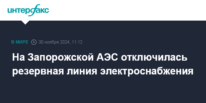 Предыдущий раз об отключении резервной линии снабжения на ЗАЭС сообщили 21 октября. Подачу электроэнергии возобновили на следующий день. В ноябре дважды отключалась основная линия электроснабжения ЗАЭС.