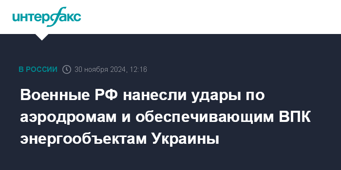Москва. 30 ноября. INTERFAX.RU - Российские военные нанесли удары по аэродромам ВСУ и связанным с ВПК Украины энергообъектам, за сутки сбиты крылатая ракета "Нептун" и 45 дронов, сообщило Минобороны РФ в субботу.