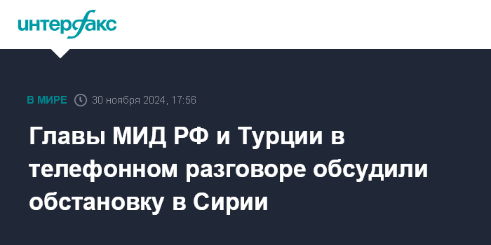 Москва. 30 ноября. INTERFAX.RU - Министр иностранных дел РФ Сергей Лавров провел телефонный разговор с министром иностранных дел Турции Хаканом Фиданом, стороны обсудили ситуацию в Сирии.