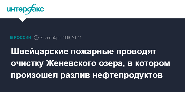 Москва. 8 сентября. INTERFAX.RU - Пожарные в Швейцарии во вторник приступили к очистке участка Женевского озера, пострадавшего от разлива нефтепродуктов. Местные СМИ сообщают, что во вторник утром в озере в районе кантона Во было обнаружено нефтяное пятно, размеры которого достигали 500 на 500 метров. Швейцарская полиция пока не определила, каким образом в Женевское озеро попали нефтепродукты.