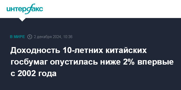Москва. 2 декабря. INTERFAX.RU - Доходность десятилетних гособлигаций Китая опустилась ниже отметки в 2% впервые более чем за 20 лет.