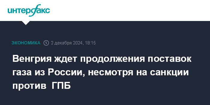 Венгрия ждет продолжения поставок газа из России, несмотря на санкции против ГПБ