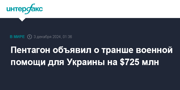 Пакет помощи оценивается в $725 млн, уточнили в ведомстве. Речь в данном случае идет о передаче Украине уже имеющегося на складах США вооружения, а не о производстве нового.