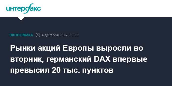Москва. 4 декабря. INTERFAX.RU - Фондовые индексы крупнейших стран Западной Европы завершили в плюсе торги во вторник, причем германский индикатор DAX впервые в истории закрылся выше отметки в 20 тыс. пунктов.