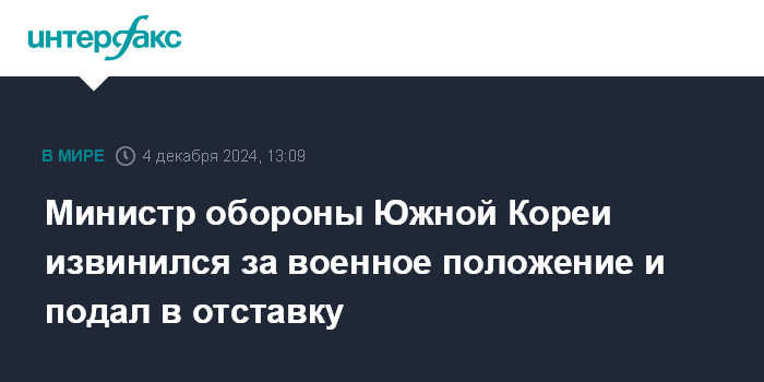 Москва. 4 декабря. INTERFAX.RU - Глава Минобороны Южной Кореи Ким Ен Хен извинился перед гражданами страны за ситуацию с введением военного положения и сообщил, что подал прошение об отставке, передает в среду агентство Yonhap.