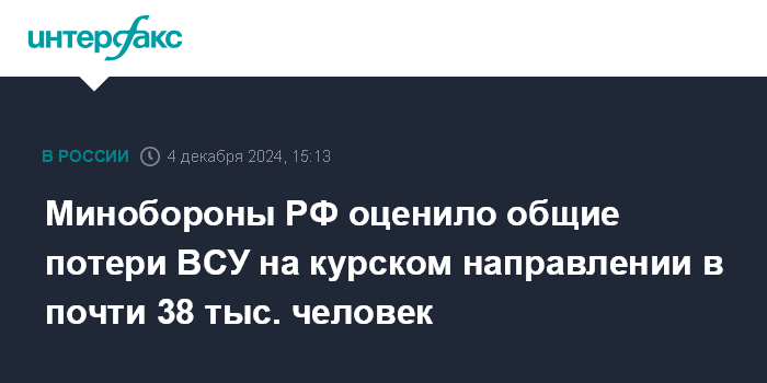 Москва. 4 декабря. INTERFAX.RU - Минобороны РФ сообщило в среду, что потери украинской армии в течение суток на курском направлении составили более 280 военнослужащих, за все время боевых действий там ВСУ потеряли почти 38 тыс. человек.