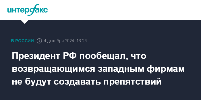Москва. 4 декабря. INTERFAX.RU - Россия не будет создавать специальных условий для западных компаний, которые захотят вернуться на ее рынок, но и препятствовать не будет, заявил президент РФ Владимир Путин.