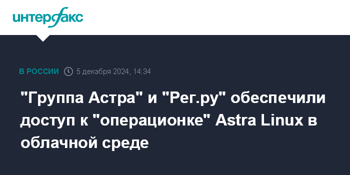 "Группа Астра" и "Рег.ру" обеспечили доступ к "операционке" Astra Linux в облачной среде
