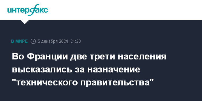 Москва. 5 декабря. INTERFAX.RU - Во Франции 66% граждан считают, что политический кризис на данном этапе требует назначения "технического правительства" из экспертов, показал опрос, проведенный исследовательским центром Elabe по заказу BFMTV.